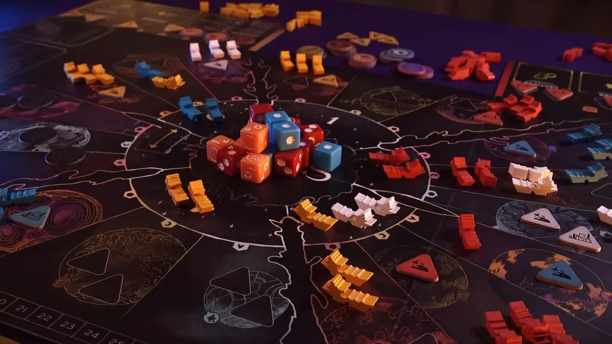 Une intelligente mécanique de dés sera au centre du jeu, mais attention ! Les dés ne sont pas utilisés pour être lancés : ils sont déjà lancés et sont communs aux joueurs. Nous allons sélectionner le meilleur dé pour soi-même à chacun de nos tours, ou celui qui embête le plus les autres joueurs. Une fois votre dé choisi sur l’un des magnifiques ponts, il vous faudra choisir un emplacement parmi 6 lieux différents. Chaque décision est complexe !
